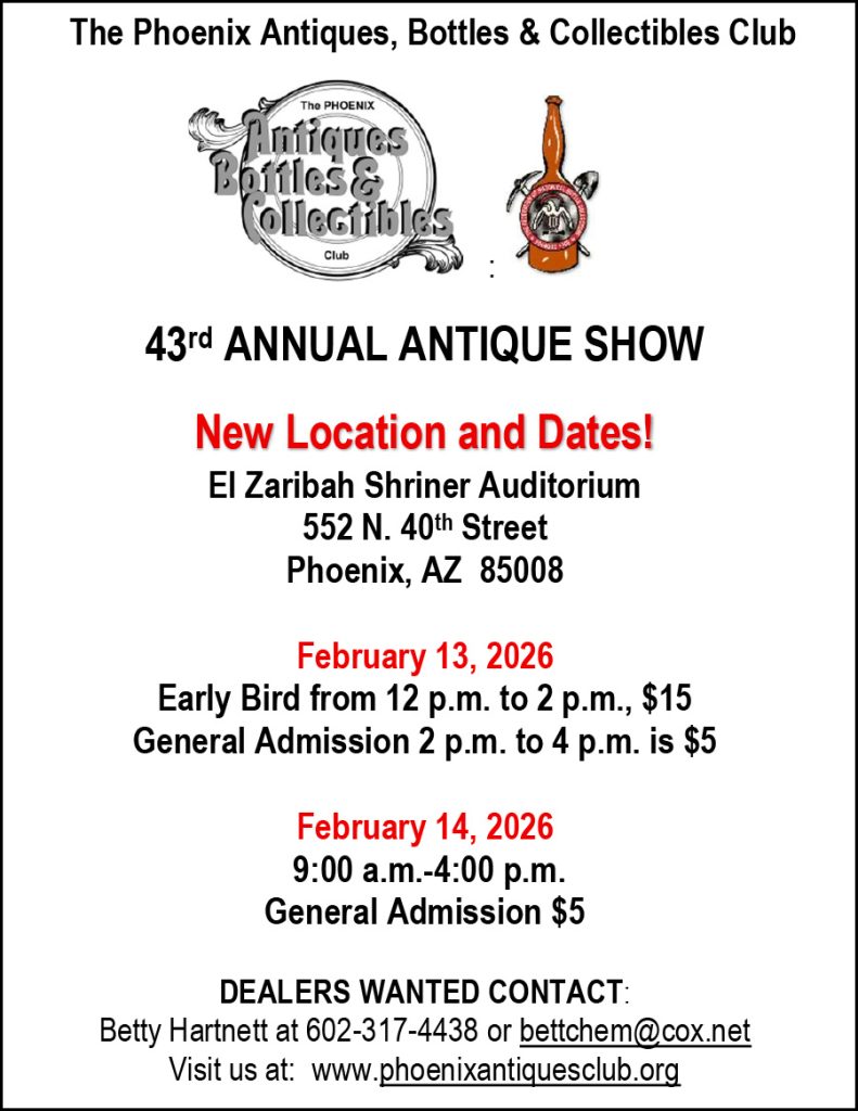 16-18 May 2025 (Friday thru Sunday) Adamstown, Pennsylvania – Shupp’s Grove 25th Annual Bottle Festival, 607 Willow Street, Reinholds, Pennsylvania 17569. Friday, early buyers only from 11 am to 5 pm at a ticket price of $20 per person and running through Sunday, 18 May. Saturday and Sunday hours are from 6 am to dusk; admission is free to all on these two days. Contact Steve Guion, Show Chairman, 1032 English Drive, Lebanon, Pennsylvania 17042, william03301956@gmail.com or call him at 717.371.1259. He has information and dealer contracts for those wishing to set up at the festival. More info.