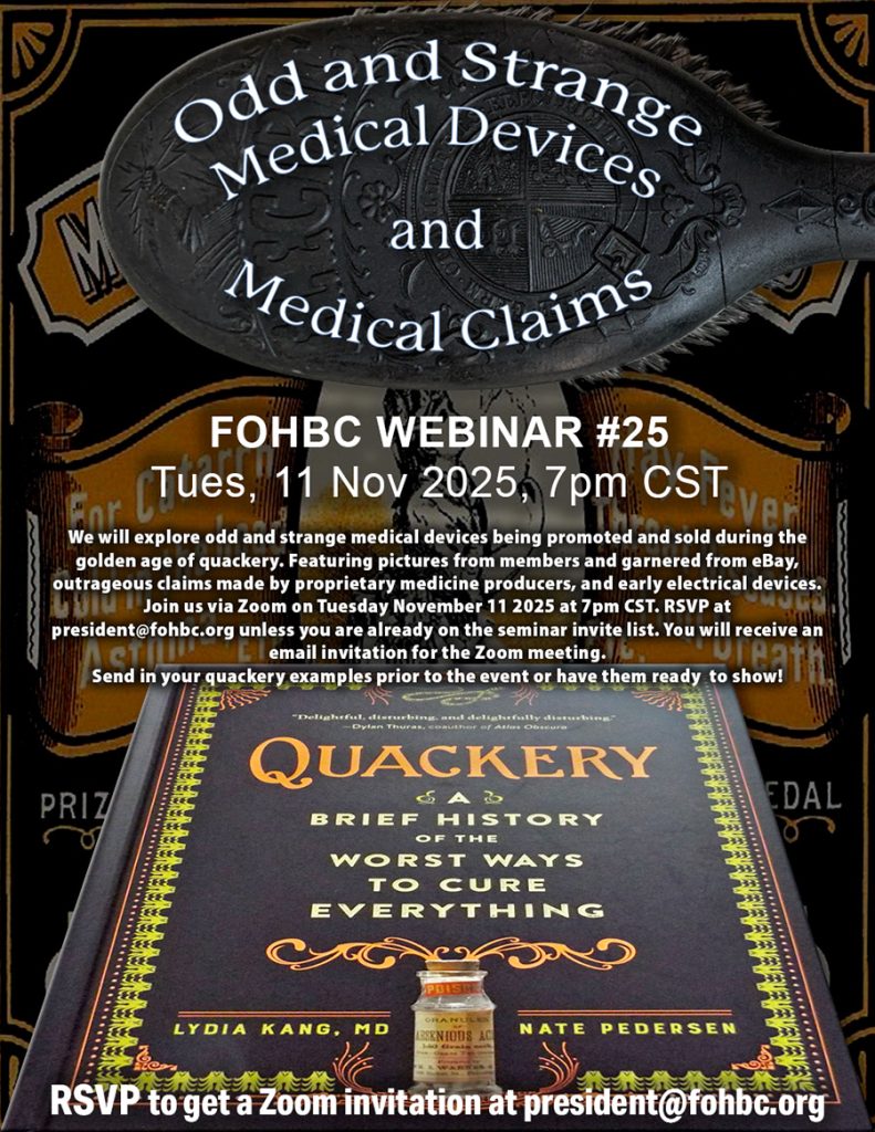 We will explore the strange and unusual advertising items that patent medicines and other manufacturers used to advertise their products. Not just trade cards, signs and posters but also odd items that they used. Join us via Zoom on Tuesday October 21, 2025 at 7pm CDT. RSVP at president@fohbc.org unless you are already on the seminar invite list. You will receive an email invitation for the Zoom meeting.