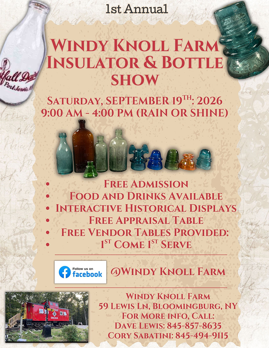 Windy Knoll Farm 59 Lewis Lane, Bloomingburg, NY, United StatesWe’re very excited about promoting the hobby and its rich history. In addition to bottles and insulators for sale, we will have displays of American insulators and historic items dug at the Ellenville Glassworks, a display of historic and unusual [...]