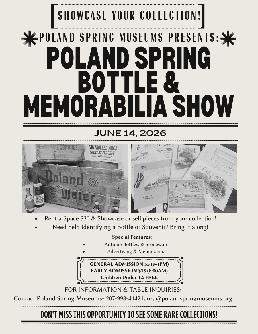 Poland Spring Water Museum 115 Preservation Way, Poland Spring, ME, United StatesA brand-new event featuring antique bottles, historic advertising, ephemera, and collective memorabilia tied to Poland Spring and Maine. Bottle collectors, antique dealers, and enthusiasts from across New England will enjoy a full weekend of events, all held at Poland Spring [...]