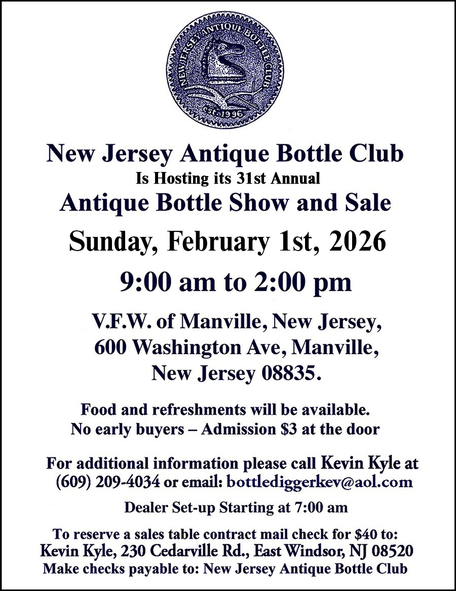 Feb 1 9:00 am - 2:00 pm New Jersey Antique Bottle Club’s 31st Annual Antique Bottle Show & Sale VFW of Manville 600 Washington Ave, Manville Event Details Get Directions