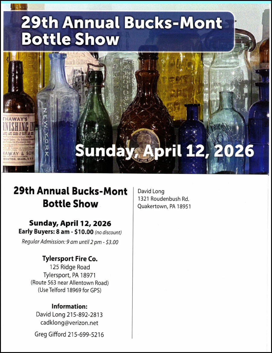 Apr 12 9:00 am - 2:00 pm 29th Annual Bucks-Mont Bottle Show Tylersport Fire Co. 125 Ridge Road, Tylersport Event Details Get Directions