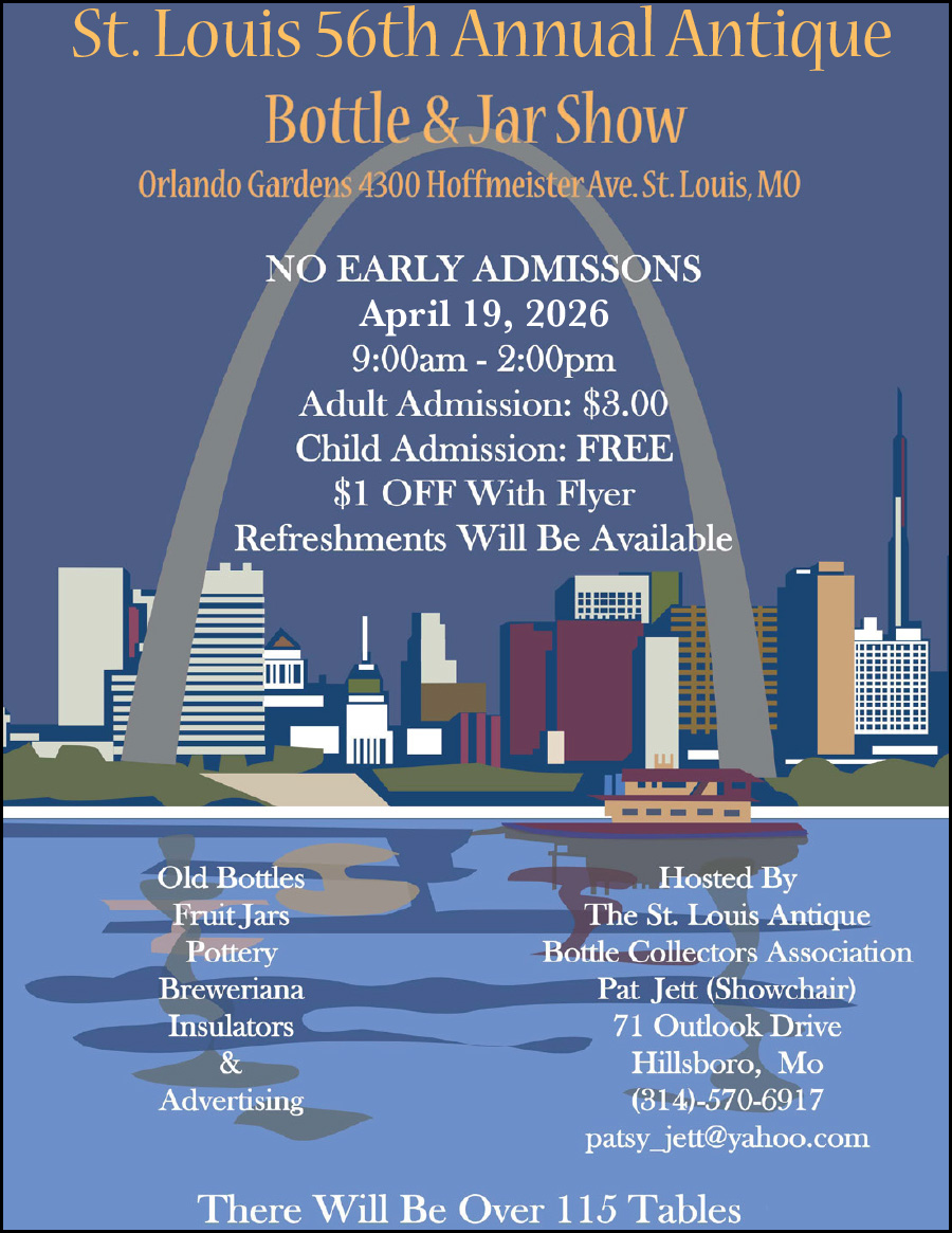 Apr 19 9:00 am - 2:00 pm St. Louis Antique Bottle Collectors Assn’s 56th Annual Antique Bottle & Jar Show Orlando Gardens 4300 Hoffmeister Ave, St. Louis Event Details Get Directions