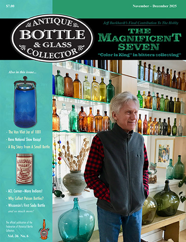 Features: The Van Vliet Jar Revealed Greg Spurgeon and Michael Seeliger 26 William F. Swasey and His California Bonzest Eric McGuire 30 The Magnificent Seven – “Color is King” in Bitters Collecting Jeffrey Burkhardt 38 Chasing Dr. Parker Peter Jablonski 44 FOHBC Reno 2025 National Antique Bottle & Glass Convention Recap 50 Wisconsin’s First Soda Bottle Todd Von Mechow 56